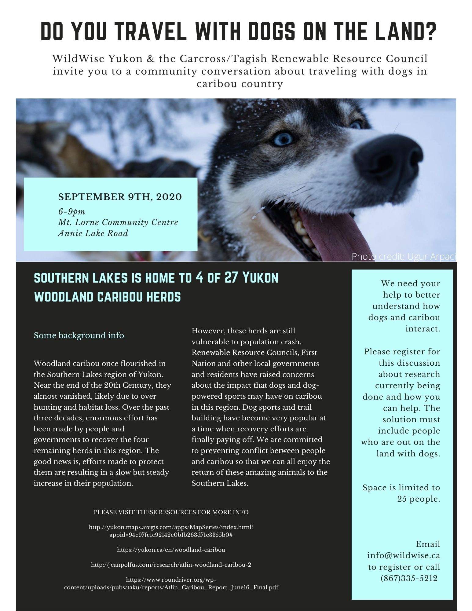 WildWise Yukon & the Carcross/Tagish Renewable Resource Council invite you to a community conversation about traveling with dogs in caribou country. September 9th, 2020 6-9pm Mt. Lorne Community Centre Annie Lake Road